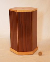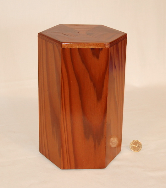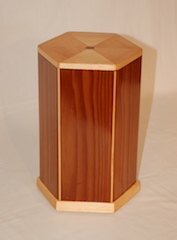 Description - This hexagon urn uses a combination of material to add interest to this urn. Material - Cedar, Maple & PineFinish - Oil-base Varnish Dimensions - 6.5in x 7.25 x 11in Volume - 171 cubic inches Opening - Bottom Item Number # - 204 Price - $150 CAD How to get it |