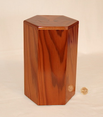 Description - This hexagon urn highlights the grain of the red cedar. Material - CedarFinish - Oil-base Varnish Dimensions - 6in x 7in x 10.25in Volume - 119 cubic inches Opening - Bottom Item Number # - 203 Price - $150 CAD How to get it |