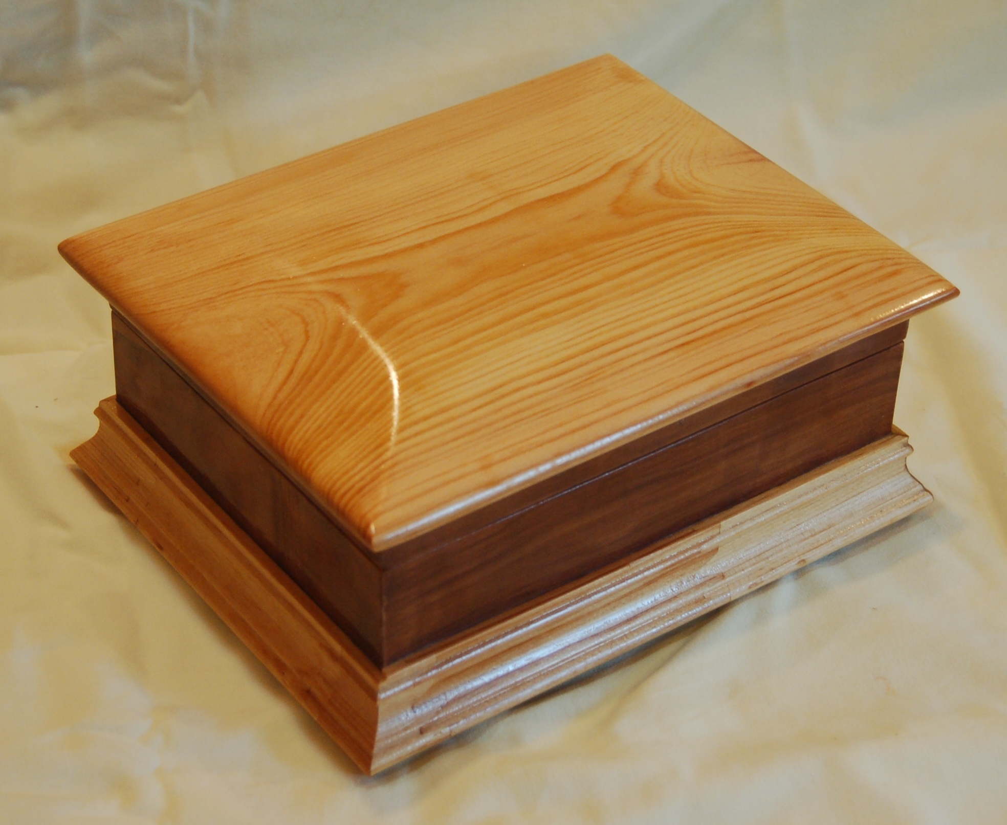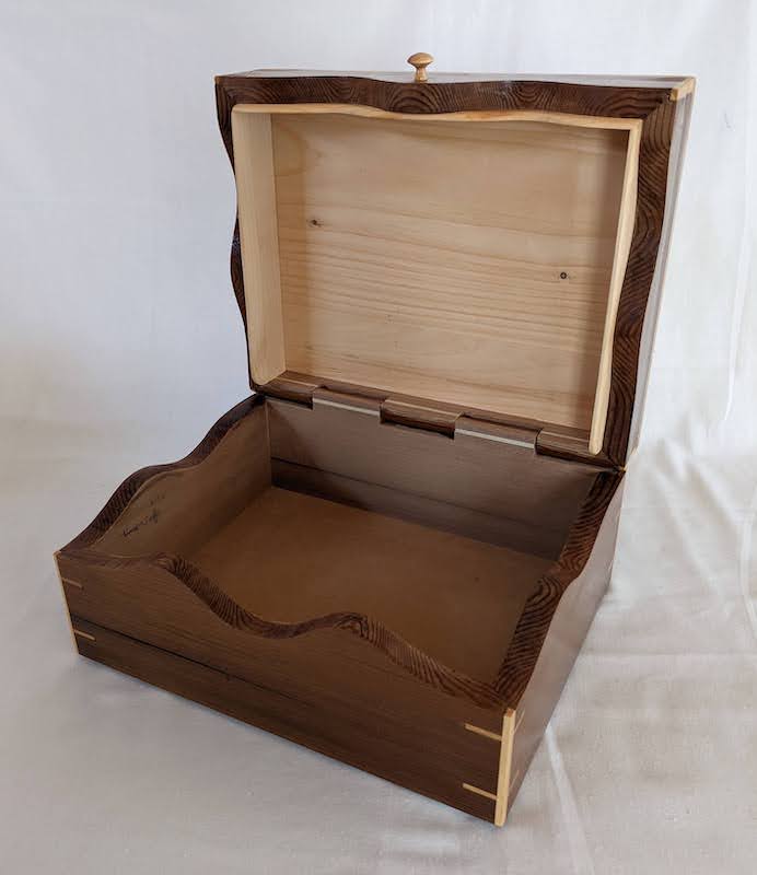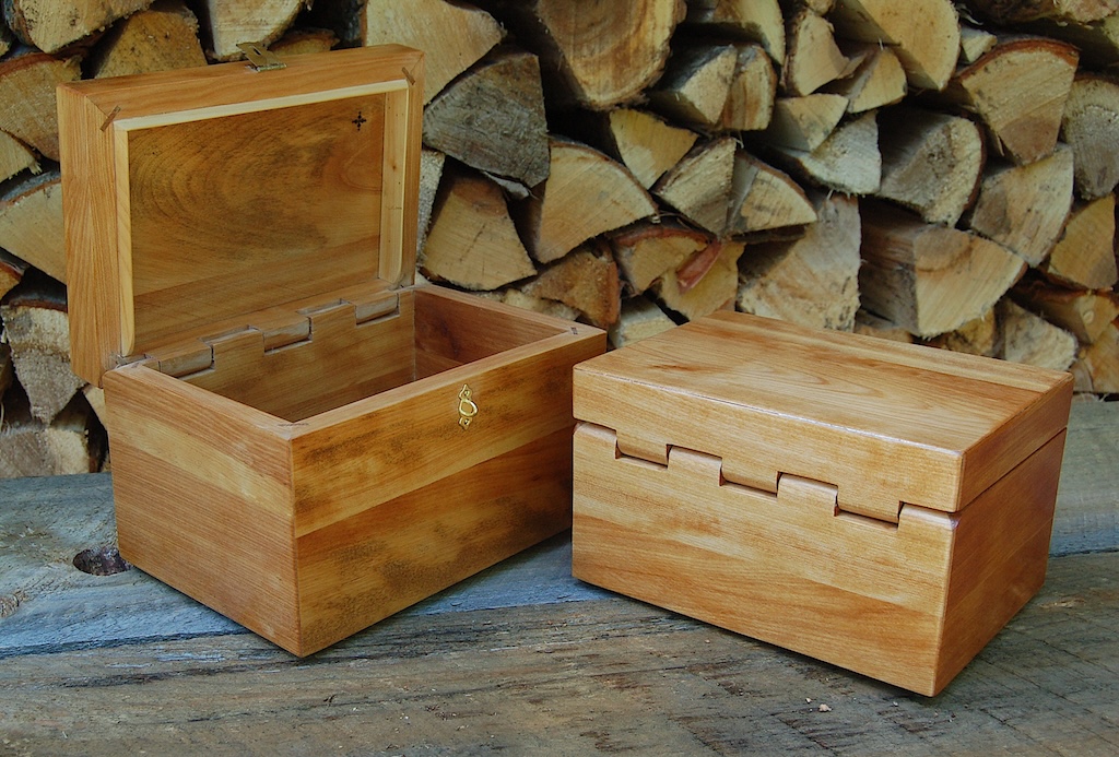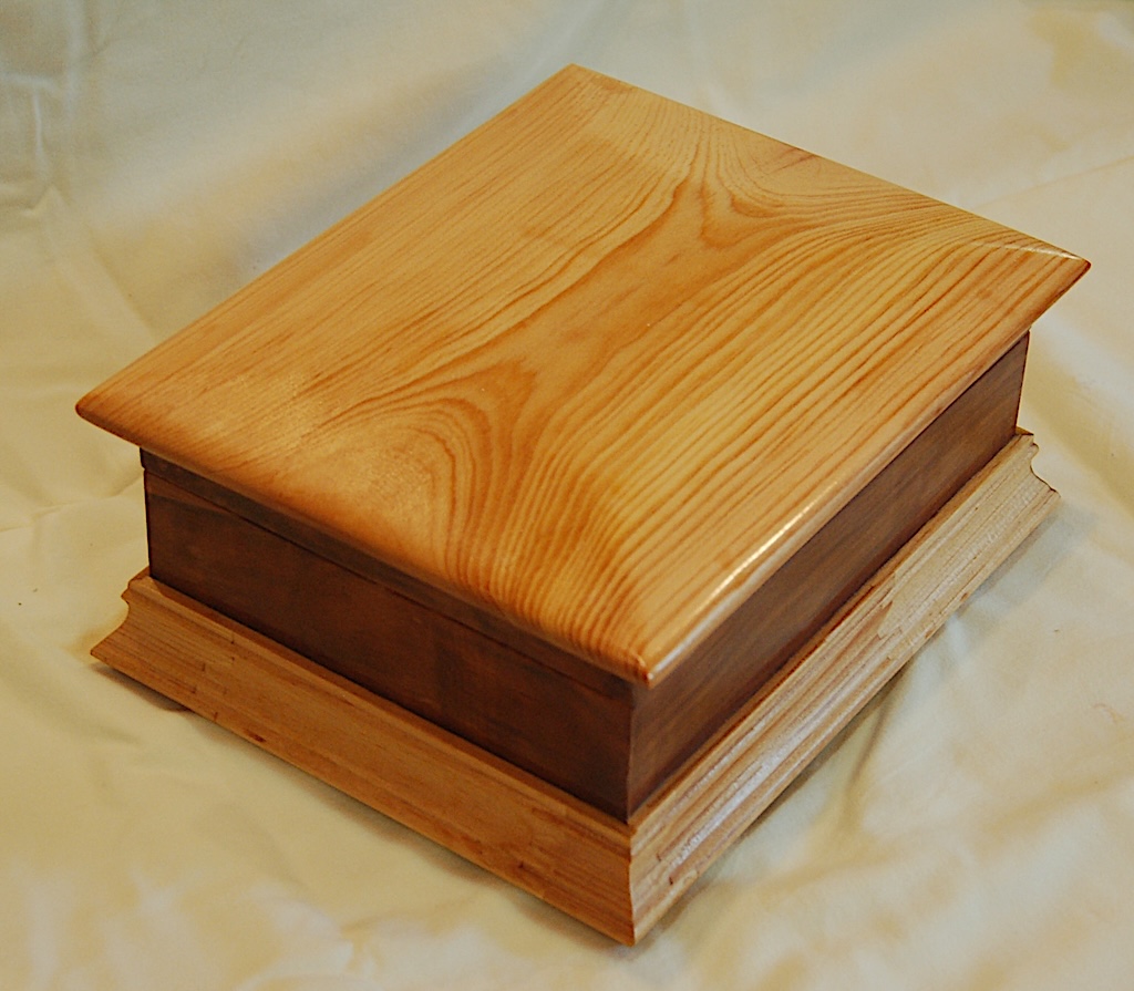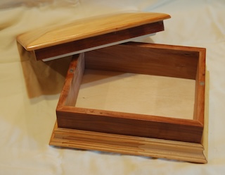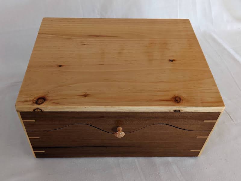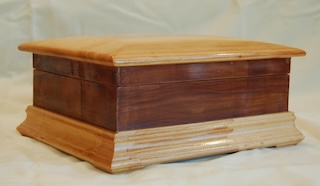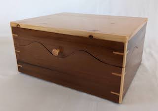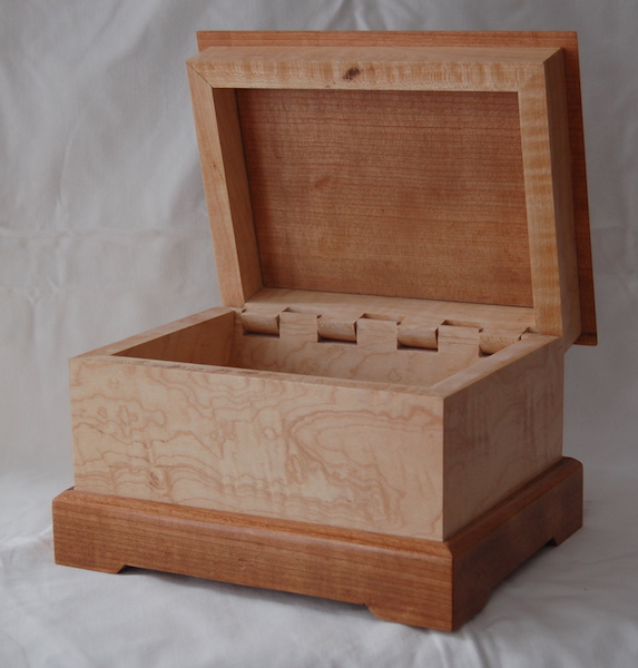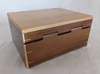 Description - This box includes a wooden hinge and made from two contrasting woods. Material - Maple and CherryFinish - Tung Oil & Carbanuba Wax Dimensions - 9.25in x 7.5in x 6in Volume - 171 cubic inches Opening - Hinged top Item Number # - P43 Price - $200 CAD How to get it |