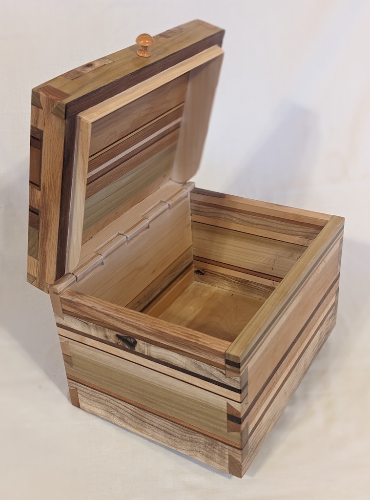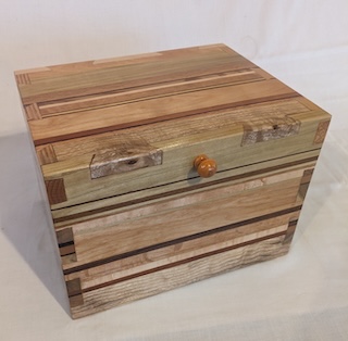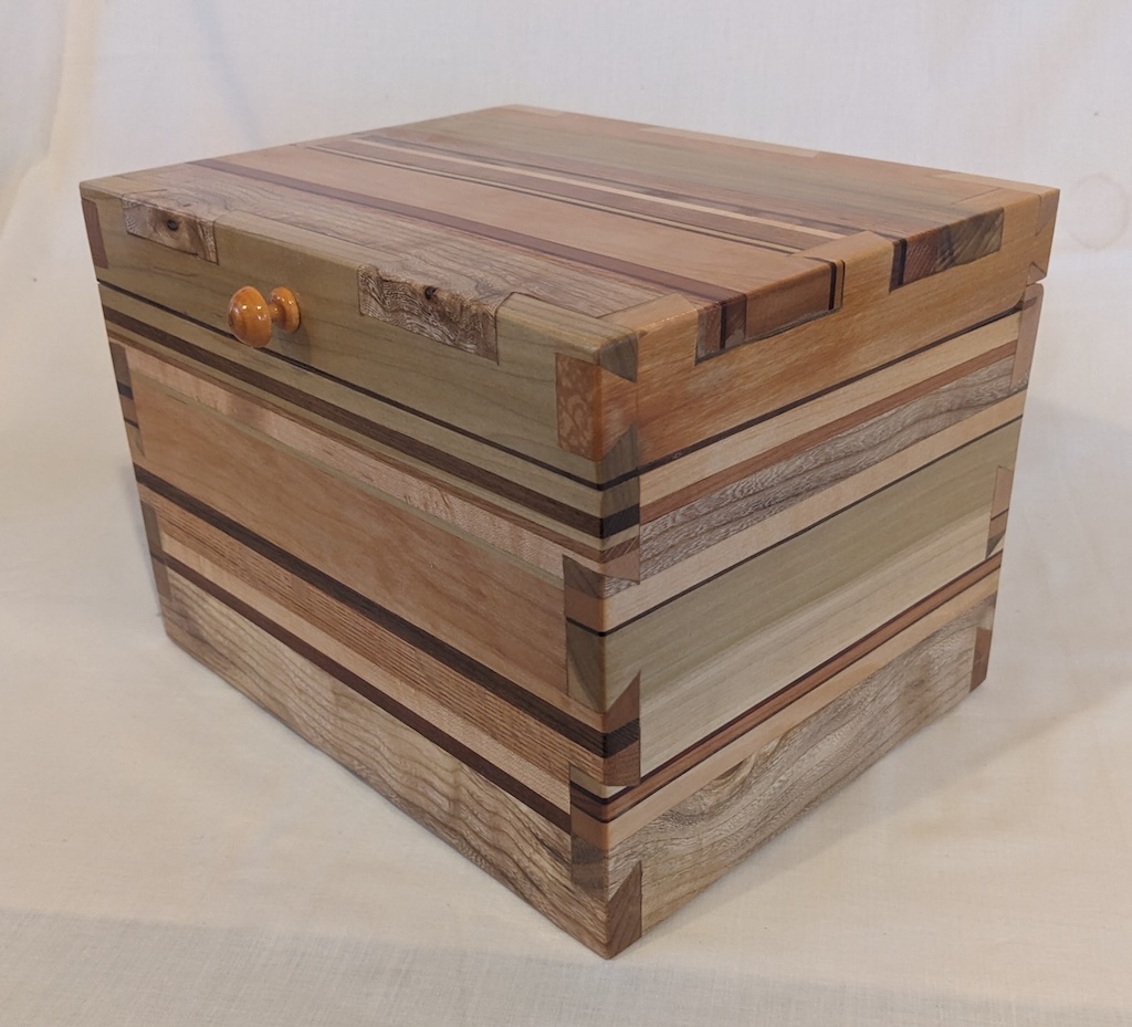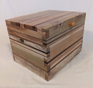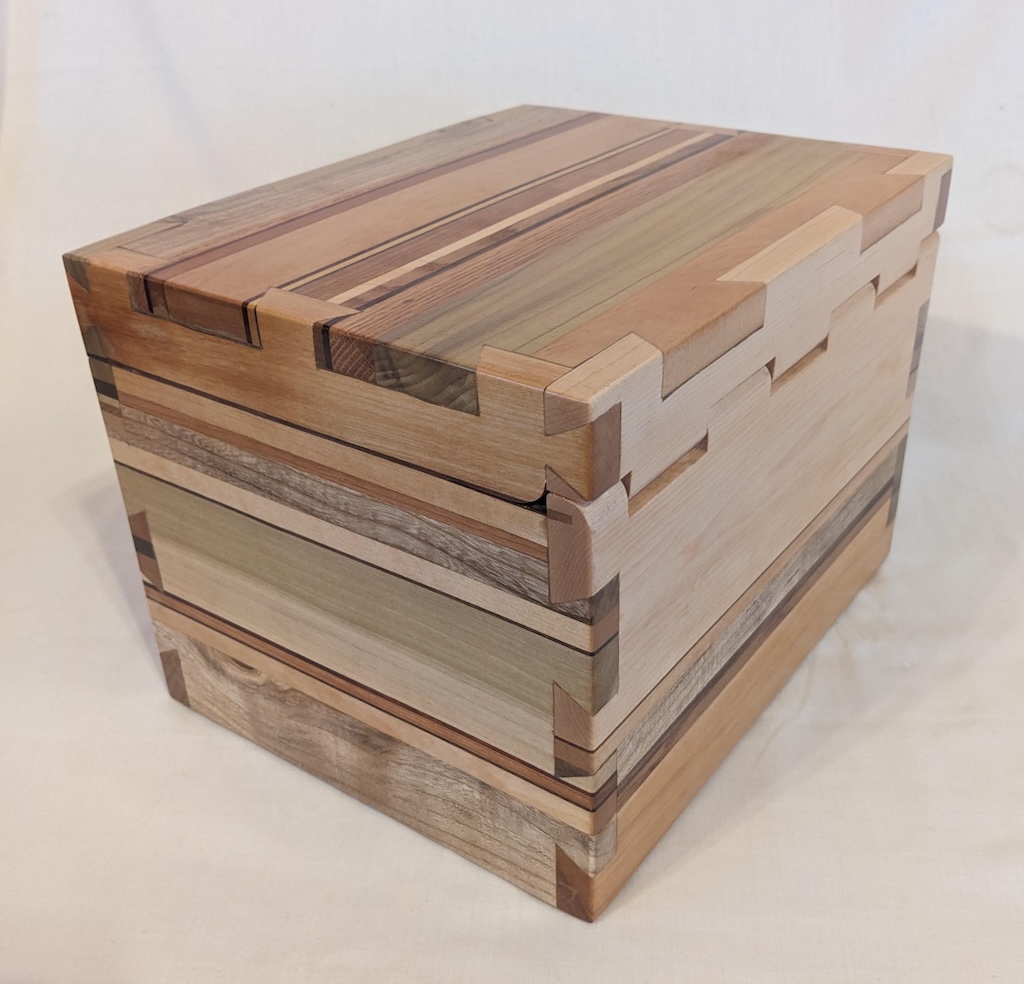 Description - This simple box incorporates a wooden hinge and handle for easy opening. It includes a number of different woods laminated together and then dovetailed together to provide a sturdy box with no exposed hardware. Material - Elm, Maple, Birch, Beech, Oak, Pine, Buckthorn, Walnut & Canary WoodFinish - Outside is Tung Oil & Carnauba Wax, while inside is mineral oil and beeswax Dimensions - 12.25in x 9.75in x 9in Volume - 555 cubic inches Opening - Hinged Top Item Number # - 238 Price - Private Collection How to get it |